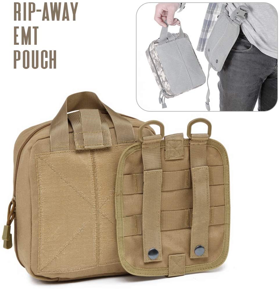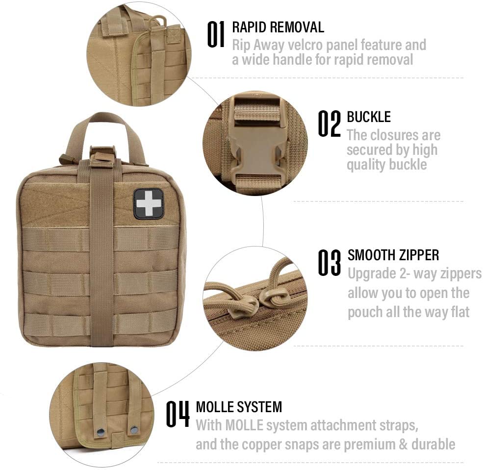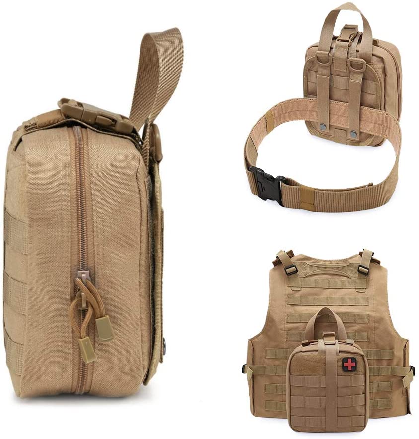 Siffar Khaki Tactical First Aid Soja Jakar Likitan ta Haɗa Red Cross Patch: TRI-FOLD DESIGN: jaka ta yi amfani da ƙira mai ninki uku, a ciki tana da ɗakunan sarari masu faɗi waɗanda suka haɗa da aljihuna da yawa, madaukai masu ƙarfi da masu riƙe kayan aiki, madauri mai aminci na Velcro, da ɗakunan ragar raga don ƙananan kayan agaji na farko.TAUH da DURABLE: Pouch ne Ya yi da High quality 1000D nailan abu, m anti-scrape da lalacewa-resistant. Ƙaƙƙarfan dinki sau biyu yana ba da wannan dabarar jakar jakar magani a kowane yanayi